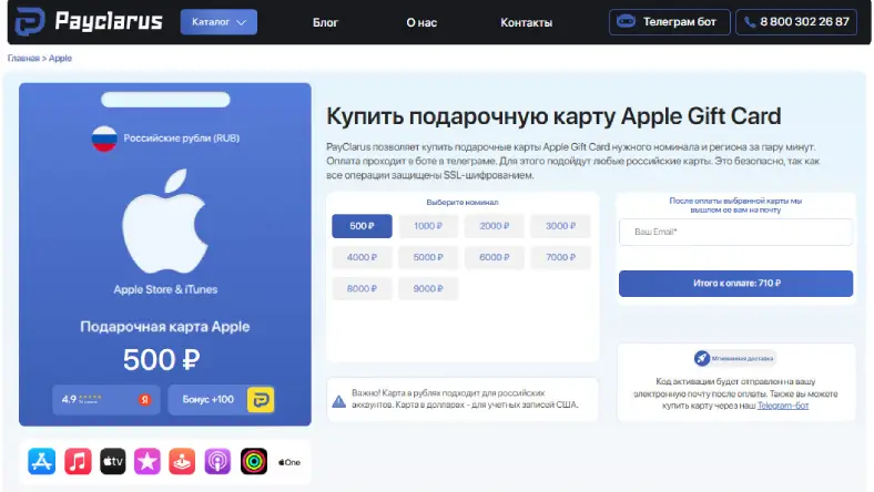 Один из самых простых и удобных способов купить подарочную карту Apple — онлайн-сервис PayClarus. Он работает через Телеграм. Пользователям не нужно скачивать никаких приложений, достаточно лишь:
